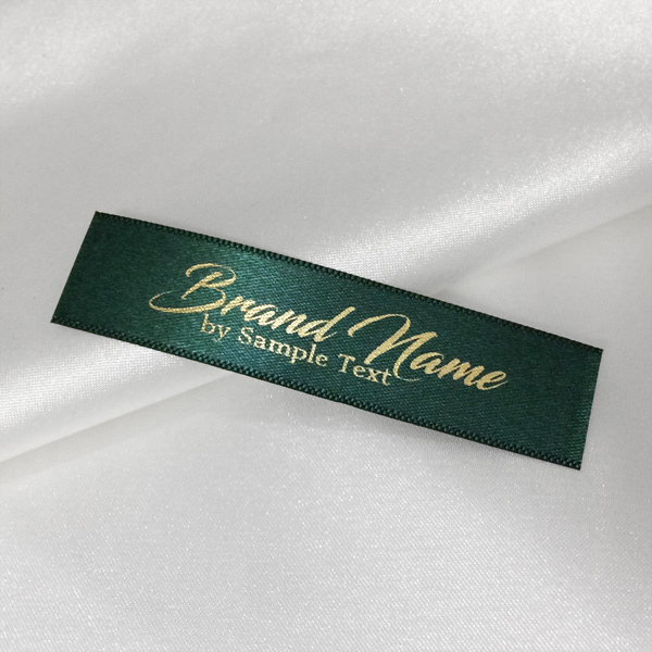 Tekstila etiķete apdrukāta ar pielāgotiem tekstiem uz satīna auduma, piegriezta atbilstoši uzrādītajiem izmēriem.