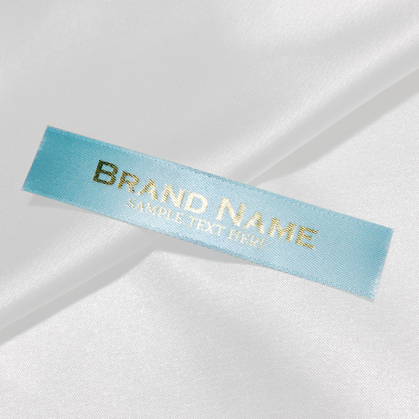 Tekstila etiķete apdrukāta ar pielāgotiem tekstiem uz satīna auduma, piegriezta atbilstoši uzrādītajiem izmēriem.
