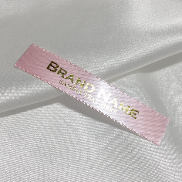 Tekstila etiķete apdrukāta ar pielāgotiem tekstiem uz satīna auduma, piegriezta atbilstoši uzrādītajiem izmēriem.
