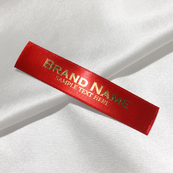 Tekstila etiķete apdrukāta ar pielāgotiem tekstiem uz satīna auduma, piegriezta atbilstoši uzrādītajiem izmēriem.
