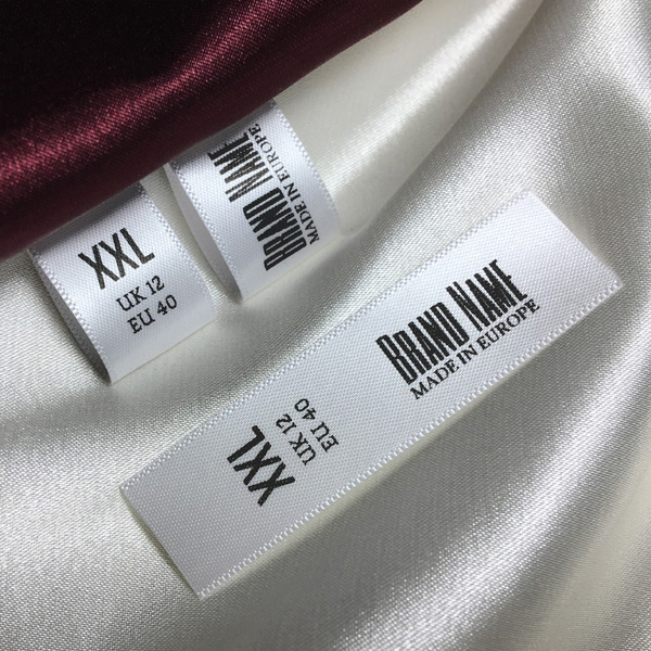 Apģērba izmēra etiķete, kas uzdrukāta uz satīna, pielāgota ar zīmola nosaukumu vai logotipu aizmugurē, piemērota apģērbam. Šāda veida tekstila etiķete tiek izgatavota, izmantojot vismodernākās tehnoloģijas digitālās drukas jomā uz tekstila balsta. Etiķetes tiek drukātas uz īpaša satīna ar termiskās pārneses metodi, ar iespaidīgu drukas kvalitāti un augstu mazgāšanas pretestību.