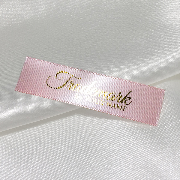 Tekstila etiķete apdrukāta ar pielāgotiem tekstiem uz satīna auduma, piegriezta atbilstoši uzrādītajiem izmēriem.