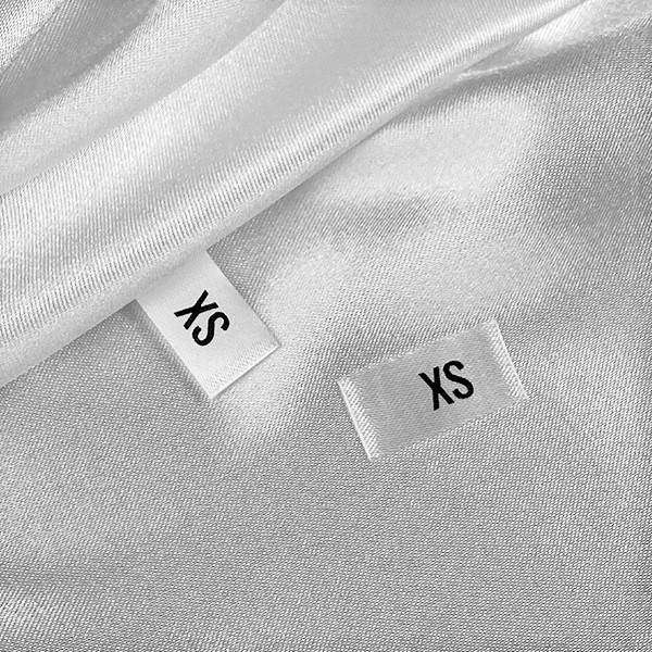 Tekstila etiķetes ar izstrādājuma izmēru vai numuru, pie kura tiks šūts, izgatavotas no balta satīna, kas apdrukāts ar melnu rakstu. Šāda veida tekstila etiķete tiek izgatavota, izmantojot vismodernākās tehnoloģijas digitālās drukas jomā uz tekstila balsta. Etiķetes tiek drukātas uz īpaša satīna ar termiskās pārneses metodi, ar iespaidīgu drukas kvalitāti un augstu mazgāšanas pretestību.