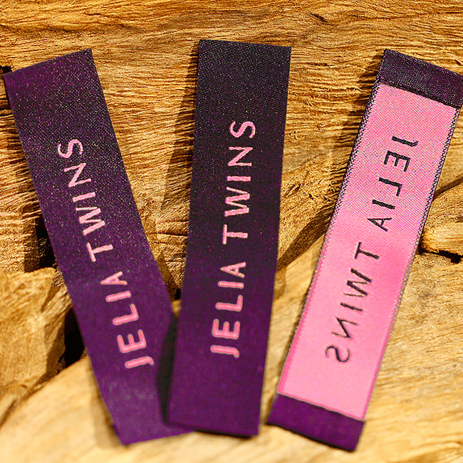 Tekstila etiķete apģērbu modelim Fashion Style ar zīmola nosaukumu vairākās krāsās uz tekstilmateriāla, piemēram, satīna, tafta vai damaska. Šāda veida austa etiķete ir izgatavota no augstas kvalitātes materiāliem, izmantojot vismodernākās tehnoloģijas no digitālās izšūšanas jomas rūpnieciskā līmenī.