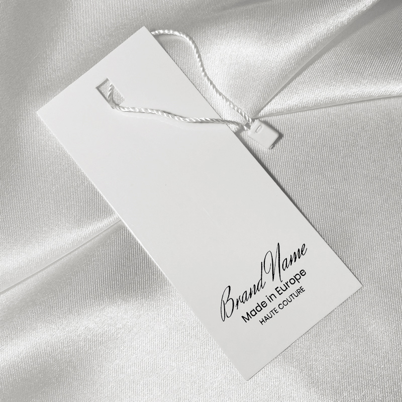 Papīra etiķete ar plastmasas zīmogu apģērbu vai dažādu tekstilizstrādājumu turēšanai, izgatavota no spīdīga plastificēta kartona, kas vienā pusē pielāgota ar tekstu un logotipu. Šāda veida piekaramais tags ir izgatavots no augstas kvalitātes materiāliem, izmantojot vismodernākās tehnoloģijas digitālās drukas un apdares jomā.