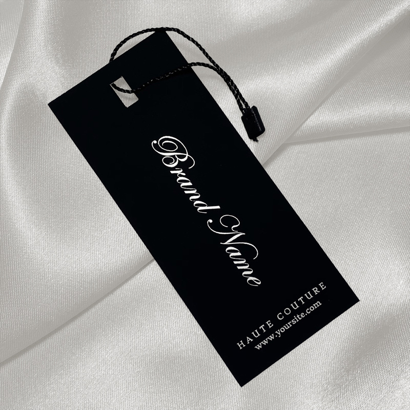 Kartona etiķete ar plastmasas blīvējumu, kas piemērots drēbēm un apģērbu aksesuāriem, izgatavots no bieza melna kartona, kas laminēts ar Soft Touch foliju, un personalizēts Folio Hot Stamp tipa sudraba raksts. Šāda veida piekaramais tags ir izgatavots no augstas kvalitātes materiāliem, izmantojot vismodernākās tehnoloģijas digitālās drukas un apdares jomā.