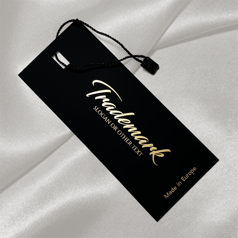 Etiķete ar auklu drēbju vai citu apģērbu izstrādājumu pakarināšanai, kas izgatavots no bieza kartona, kas laminēts ar Soft Touch foliju ar zelta rakstu. Šāda veida piekaramais tags ir izgatavots no augstas kvalitātes materiāliem, izmantojot vismodernākās tehnoloģijas digitālās drukas un apdares jomā.