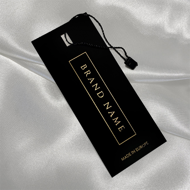 Kartona karājas birka ar zelta rakstu un melnu fonu, aprīkota ar auklu apģērbu izstrādājumiem, izgatavota no bieza Soft Touch, kas laminēta no abām pusēm kartona. Šāda veida piekaramais tags ir izgatavots no augstas kvalitātes materiāliem, izmantojot vismodernākās tehnoloģijas digitālās drukas un apdares jomā.