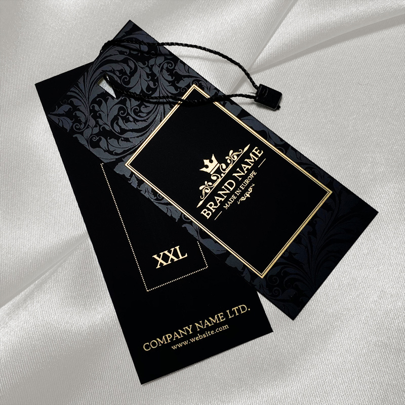 Apģērbu etiķetes ar Premium dizainu un zīmogu ar melnu auklu, izgatavotas no Soft Touch laminēta kartona un personalizēta raksta ar zelta foliju. Šāda veida piekaramais tags ir izgatavots no augstas kvalitātes materiāliem, izmantojot vismodernākās tehnoloģijas digitālās drukas un apdares jomā.