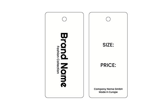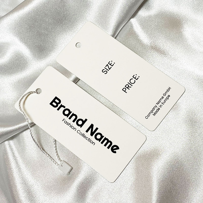 Kartona etiķete ar piekārtu auklu drēbēm vai dažādiem apģērba aksesuāriem, personalizēta ar zīmola nosaukumu vai logotipu, kā arī cita informācija par produktu, ar apdruku no abām pusēm. Šāda veida piekaramais tags ir izgatavots no augstas kvalitātes materiāliem, izmantojot vismodernākās tehnoloģijas digitālās drukas un apdares jomā.