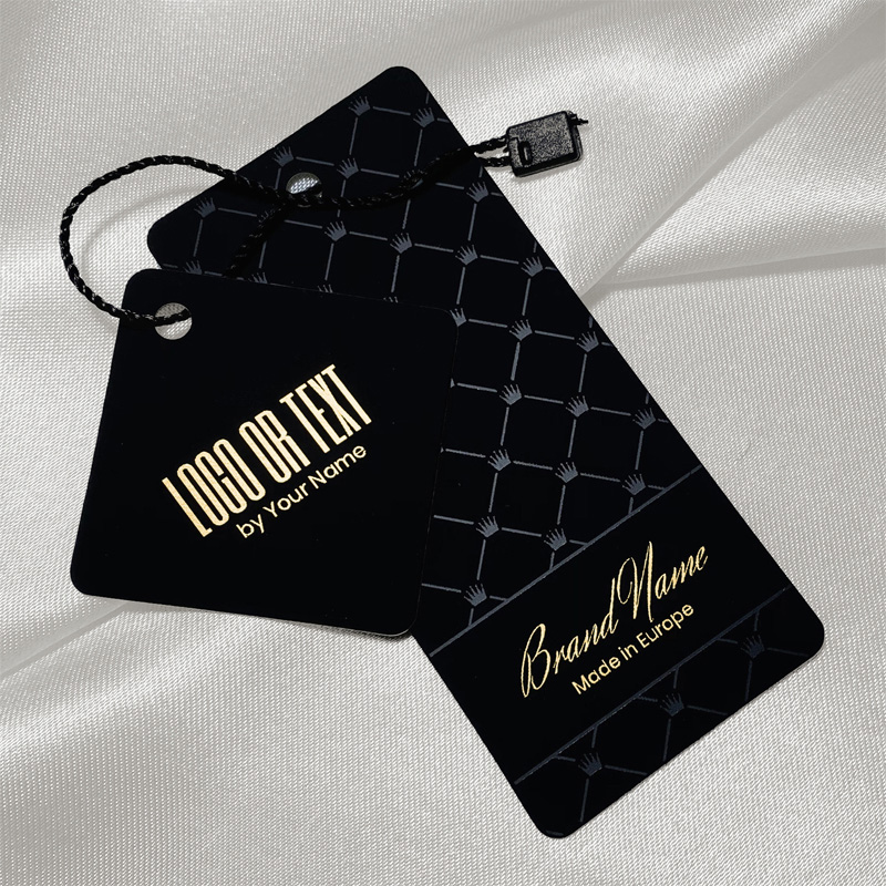 Augstākās kvalitātes apģērbu etiķetes, aprīkotas ar plastmasas blīvējumu ar melnu auklu, izgatavotas no Soft Touch laminēta kartona un personalizētas ar zelta foliju. Šāda veida piekaramais tags ir izgatavots no augstas kvalitātes materiāliem, izmantojot vismodernākās tehnoloģijas digitālās drukas un apdares jomā.