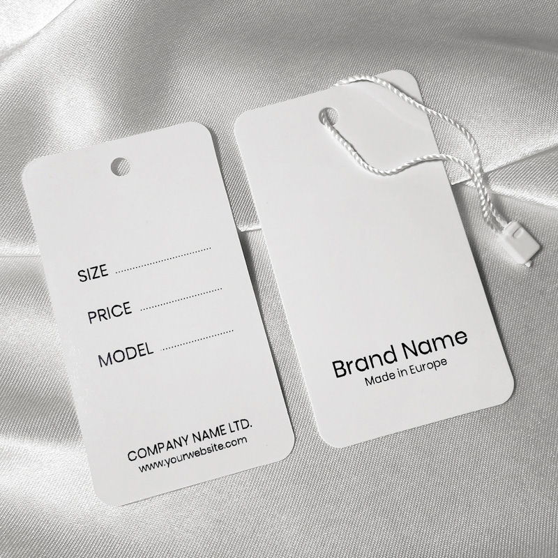Apģērba piekares birka, kas izgatavota no bieza laminēta kartona ar spīdīgu foliju un personalizēta priekšpusē un aizmugurē ar zīmola nosaukumu vai logotipu, aprīkota ar zīmogu ar auklu pakarināšanai uz dažādiem apģērba priekšmetiem. Šāda veida piekaramais tags ir izgatavots no augstas kvalitātes materiāliem, izmantojot vismodernākās tehnoloģijas digitālās drukas un apdares jomā.