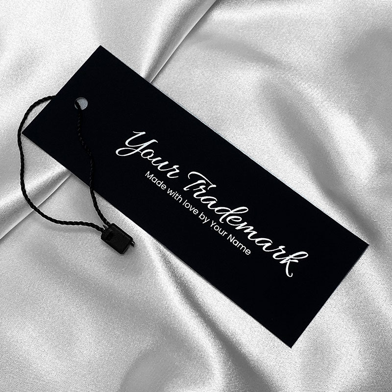 Personalizēta pakaramā birka, kas izgatavota no melna kartona ar sudraba rakstu, ar vienkāršu, bet ļoti elegantu dizainu apģērbiem, apaviem vai dažādiem apģērba piederumiem. Šāda veida piekaramais tags ir izgatavots no augstas kvalitātes materiāliem, izmantojot vismodernākās tehnoloģijas digitālās drukas un apdares jomā.