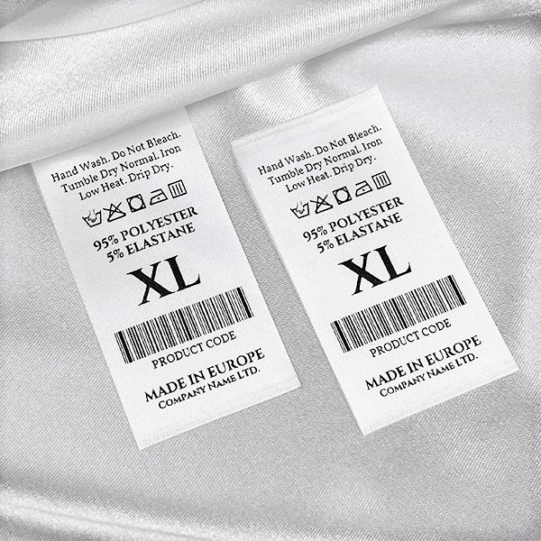 Tekstila etiķete, kas pielāgota ar svītrkodiem, mazgāšanas un izmēra simboliem, apkopes instrukcijām un ražotāja nosaukumu, kas izgatavots no smalka balta satīna. Šāda veida tekstila etiķete tiek izgatavota, izmantojot vismodernākās tehnoloģijas digitālās drukas jomā uz tekstila balsta. Etiķetes tiek drukātas uz īpaša satīna ar termiskās pārneses metodi, ar iespaidīgu drukas kvalitāti un augstu mazgāšanas pretestību.