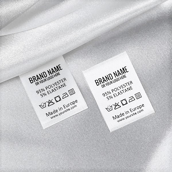 Veļas kopšanas etiķete, kas pielāgota ar zīmola nosaukumu, auduma sastāvu, mazgāšanas un kopšanas simboliem, uzdrukāta uz balta satīna un ultrasoniski sagriezta malās. Šāda veida tekstila etiķete tiek izgatavota, izmantojot vismodernākās tehnoloģijas digitālās drukas jomā uz tekstila balsta. Etiķetes tiek drukātas uz īpaša satīna ar termiskās pārneses metodi, ar iespaidīgu drukas kvalitāti un augstu mazgāšanas pretestību.
