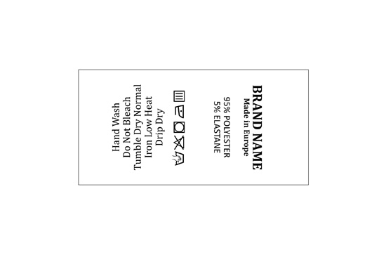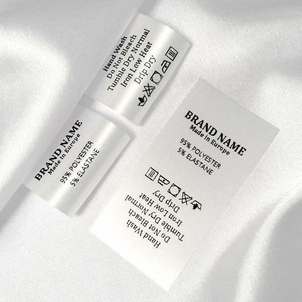Apģērbu mazgāšanas etiķete, pielāgota ar melniem tekstiem, kas uzdrukāti uz balta satīna ar smalku tekstūru. Šāda veida tekstila etiķete tiek izgatavota, izmantojot vismodernākās tehnoloģijas digitālās drukas jomā uz tekstila balsta. Etiķetes tiek drukātas uz īpaša satīna ar termiskās pārneses metodi, ar iespaidīgu drukas kvalitāti un augstu mazgāšanas pretestību.