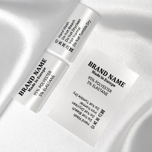 Mazgāšanas etiķete izgatavota no smalka balta satīna, apdrukāta ar pielāgotu melnu tekstu, piemērota dažādiem apģērbiem. Šāda veida tekstila etiķete tiek izgatavota, izmantojot vismodernākās tehnoloģijas digitālās drukas jomā uz tekstila balsta. Etiķetes tiek drukātas uz īpaša satīna ar termiskās pārneses metodi, ar iespaidīgu drukas kvalitāti un augstu mazgāšanas pretestību.