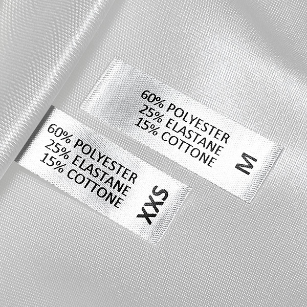 Pēc pasūtījuma izgatavota veļas kopšanas etiķete ar izmēriem, izgatavota no augstākās kvalitātes satīna, ar datiem par materiāla sastāvu, apģērbu šūšanai. Šāda veida tekstila etiķete tiek izgatavota, izmantojot vismodernākās tehnoloģijas digitālās drukas jomā uz tekstila balsta. Etiķetes tiek drukātas uz īpaša satīna ar termiskās pārneses metodi, ar iespaidīgu drukas kvalitāti un augstu mazgāšanas pretestību.