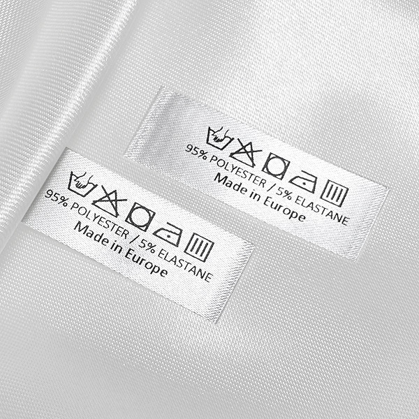 Tekstila etiķete ar mazgāšanas un apkopes simboliem apģērbu šūšanai, personalizēta ar informāciju par materiāla sastāvu un ražotājvalsti. Šāda veida tekstila etiķete tiek izgatavota, izmantojot vismodernākās tehnoloģijas digitālās drukas jomā uz tekstila balsta. Etiķetes tiek drukātas uz īpaša satīna ar termiskās pārneses metodi, ar iespaidīgu drukas kvalitāti un augstu mazgāšanas pretestību.