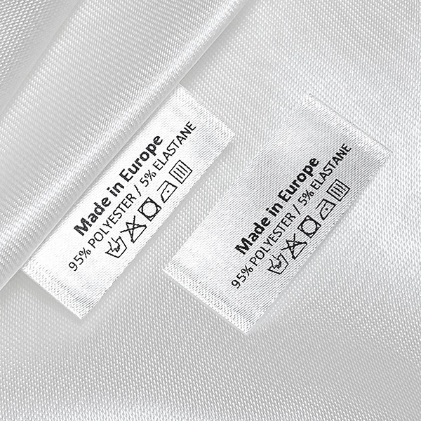 Personalizēta satīna etiķete ar mazgāšanas un kopšanas simboliem no tekstilmateriāla, no kura izgatavots apģērba gabals, apģērba šūšanai. Šāda veida tekstila etiķete tiek izgatavota, izmantojot vismodernākās tehnoloģijas digitālās drukas jomā uz tekstila balsta. Etiķetes tiek drukātas uz īpaša satīna ar termiskās pārneses metodi, ar iespaidīgu drukas kvalitāti un augstu mazgāšanas pretestību.